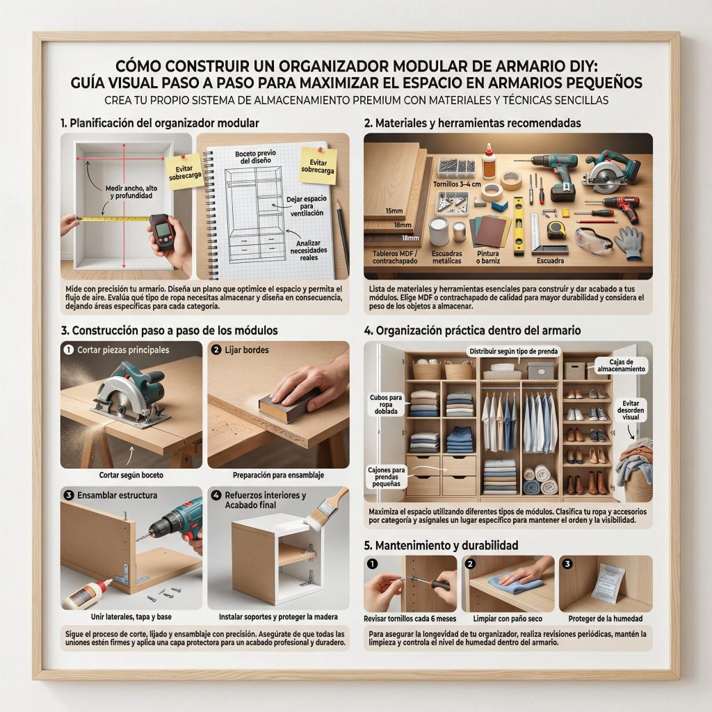 Los armarios pequeños suelen convertirse en espacios caóticos donde ropa, zapatos y accesorios se mezclan sin orden. Un organizador modular DIY es una solución económica, flexible y completamente personalizable que te permite crear más espacio útil sin necesidad de reformas costosas. En esta guía aprenderás cómo diseñar módulos, qué materiales utilizar, cómo armarlos de manera segura y cómo distribuirlos según tus necesidades. También conocerás ideas prácticas para mantener la organización a largo plazo y aprovechar cada centímetro del armario.